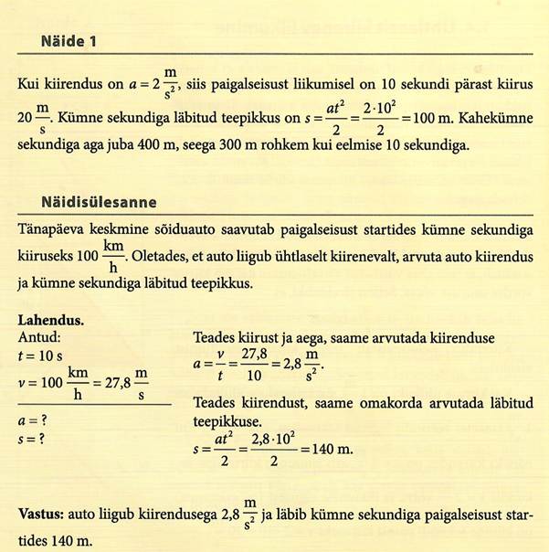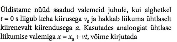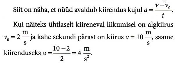 Siin konstantset suurust a nimetatakse liikumise kiirenduseks. Kui alghetkel t=0 s on keha paigal, siis kiirendus a näitab mistahes võrdsetes ajavahemikes kasvab kkrus võrdse suuruse võrra, siit järeldub, et