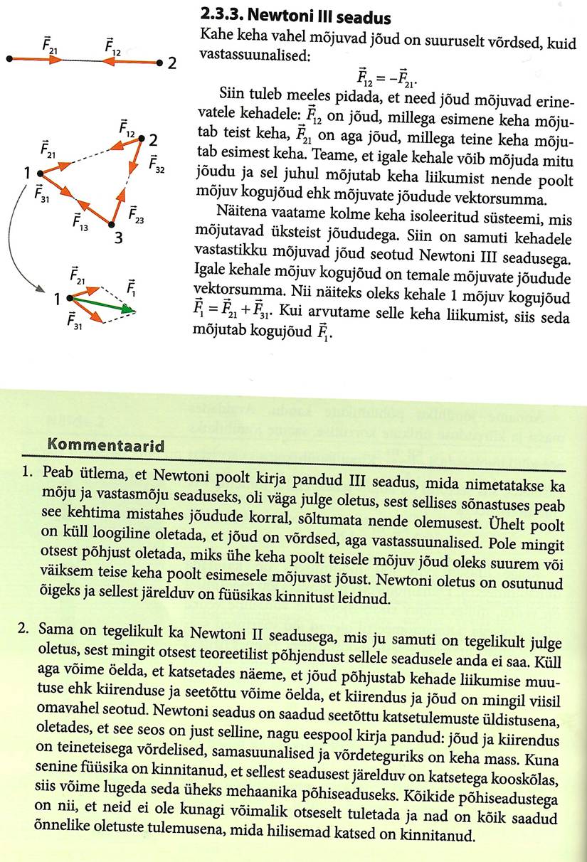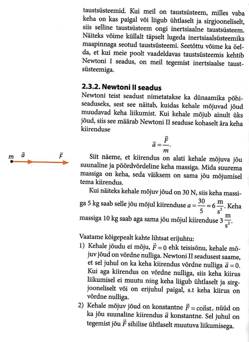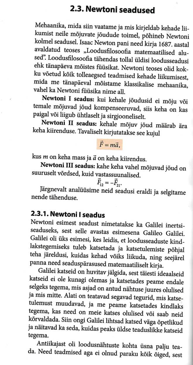 Newtoni seadused. Newtoni esimene seadus, inertsiaalne taustsüsteem. Mass. Jõud. Newtoni teine seadus, jõudude liitmine. Jõu mõõtühik. Newtoni 3. seadus (Galilei relatiivsusprintsiip). Kiirendusega liikuva keha kaal. Kaalutus ja ülekoormus.