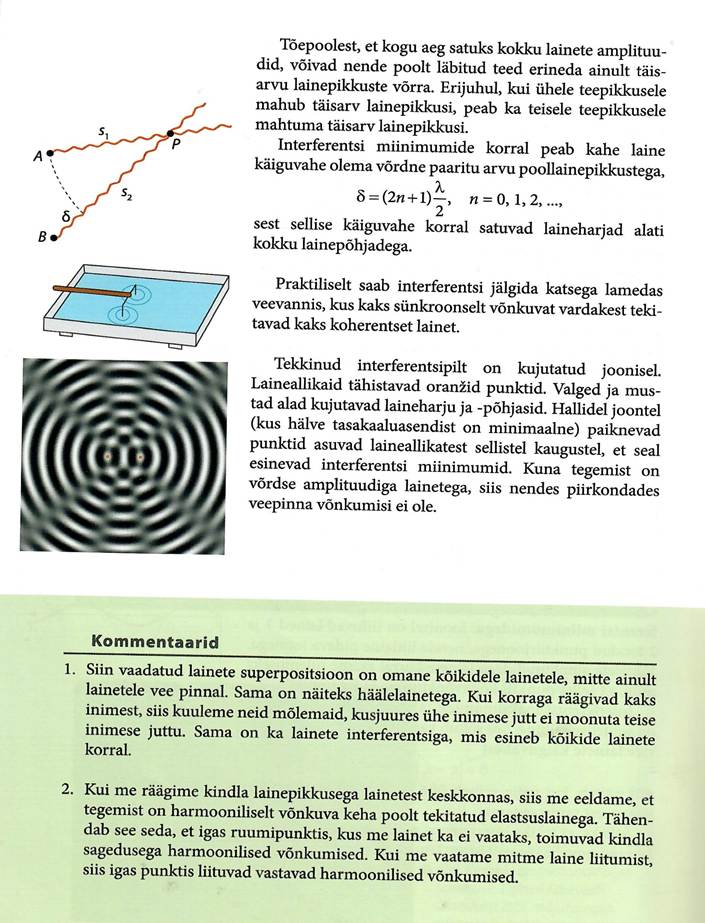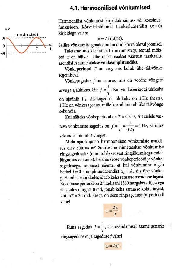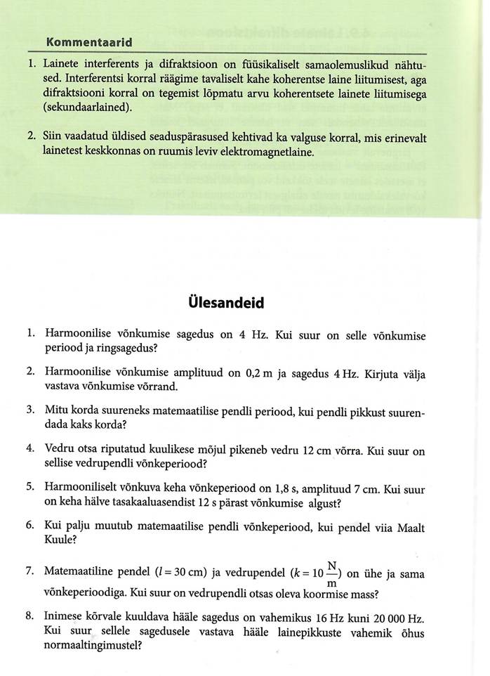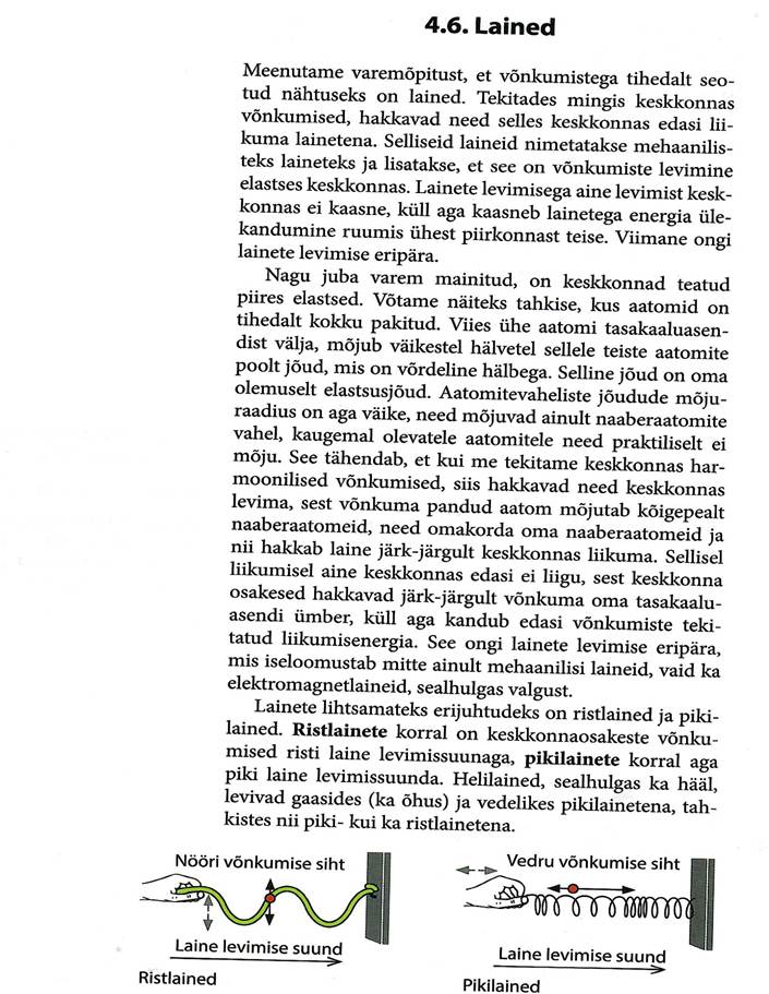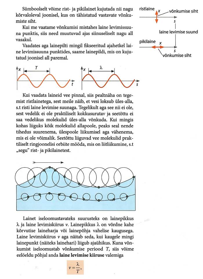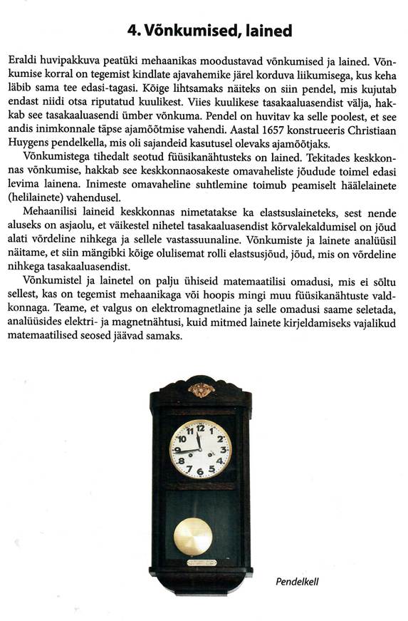 Võnkumisega seotud põhimõisted, matemaatiline pendel ja vedrupendel. Matemaatiline pendel, energia muutumine võnkumisel. Võnkumise levimine elastses keskkonnas. Laine levimise kiiruse seos lainepikkuse ja sagedusega. Lainete interferents, Hygensi printsiip, lainete peegeldumine ja lainete difraktsioon.